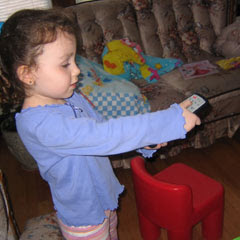 She wanted her backpack and rainboots on for the movie. | Smart one... she knows all the buttons on the remote. |